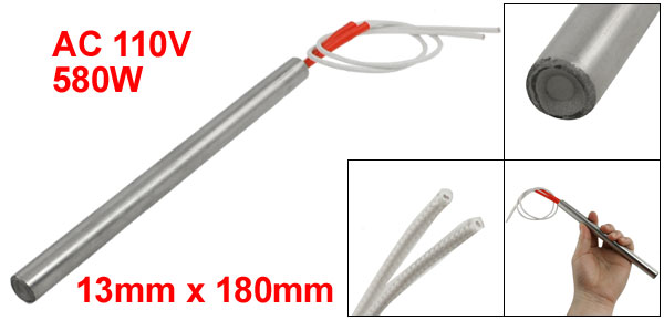 Product Name Cartridge Heater Material Stainless Steel, PVC, Nylon Rated Voltage AC 110V Power 580W Heater Size (Approx.) 13 x 180mm / 0.51" x 7.1" (D * L ) Wire Length (Approx.) 29cm / 11.4" Color Silver Tone, Red, White Weight 98g Package Content 1 x Cartridge Heater - Reviews