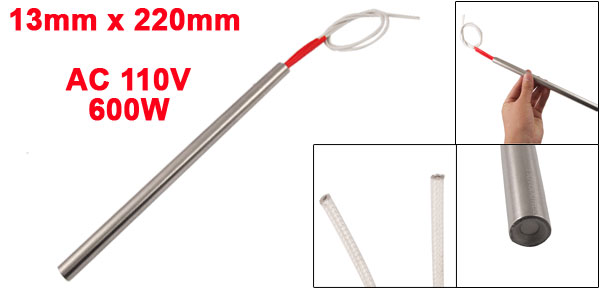 Product Name Cartridge Heater Material Stainless Steel, PVC, Nylon Rated Voltage AC 110V Power 600W Heater Size (Approx.) 13 x 220mm / 0.51" x 8.7" (D * L) Wire Length (Approx.) 29cm/ 11.4" Color Red, Silver Tone Weight 120g Package Content 1 x Cartridge Heater - Reviews