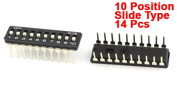 Product Name DIP Switch Type Slide Type Poles 10 Position 20Pin (2Row) Pitch 2.54mm Non-Switching Rating 100mA DC 50V Switching Rating 25mA DC 24V Dimension 27 x 9 x 7cm/ 1.1" x 0.35" x 0.28"(L*W*H) Material Plastic, Electric Parts Main Color Black, White, Silver Tone Weight 91g Package Content 14 Pcs x DIP Switches - Reviews