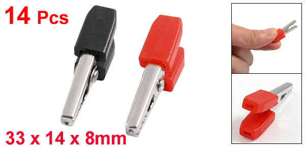 Product Name Alligator Clip Material Plastic, Metal Color Black, Red, Silver Tone Overall Size(Each) 33 x 14 x 8mm / 1.3" x 0.6" x 0.3"(L*W*T) Jaw Open Width 5mm / 0.196"(Max.) Weight 25g Package Content 14 x Alligator Clips - Reviews