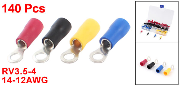 Product Name Ring Terminal Model RV3.5-4 Fit Cable Size 2.5-4mm2 (14-12AWG) 8# Hole Dia 6mm/0.24" Total Length 24.5mm/ 1'' Max. Current 37A Material PVC Plastic, Metal Color Black, Red Weight 185g Package Content 140 Pcs (±2%) x Ring Terminal - Reviews
