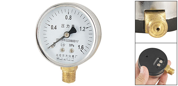 Product Name Compressor Gauge Material Metal, Plastic Type Dial Type Pressure Range 0 - 1.6 MPa Thread Diameter 14mm/ 0.55" Case Size (Approx) 7.6 x 6 x 2.6cm/ 3" x 2.3" x 1" (L*W*T) Color Silver Tone, Black, Gold Tone Weight 91g Package Content 1 x Compressor Gauge - Reviews