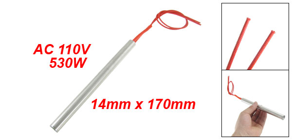 Product Name Cartridge Heater Material Stainless Steel, PVC, Nylon Rated Voltage AC 110V Power 530W Heater Size (Approx.) 14 x 170mm/0.55'' x 6.7'' (D * L) Wire Length (Approx.) 28.5cm / 11.2" Color Red, Silver Tone Weight 102.5g Package Content 1 x Cartridge Heater - Reviews
