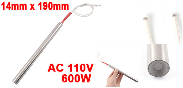 Product Name Cartridge Heater Material Stainless Steel, PVC, Nylon Rated Voltage AC 110V Power 600W Heater Size (Approx.) 14 x 190mm/ 0.55'' x 7.5'' (D * L)