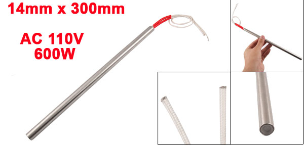 Product Name Cartridge Heater Material Stainless Steel, PVC, Nylon Rated Voltage AC 110V Power 600W Heater Size (Approx.) 14mm x 300mm / 0.55" x 11.8" (D * L) Wire Length (Approx.) 29cm/ 11.4" Color Red, Silver Tone Weight 184g Package Content 1 x Cartridge Heater - Reviews
