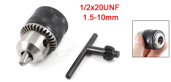 1.5-10mm/ 0.1" - 0.4" Mount 1/2X20UNF Drill Chuck Outer Dia 33mm/1.3" Drill Chuck Total Length 59mm/2.3" Key Size 56 x 32mm/ 2.2" x 1.3" (L * W) Color Black, silver Tone Material Steel, Metal, Rubber Weight 160g Package Content 1 x Drill Chuck
