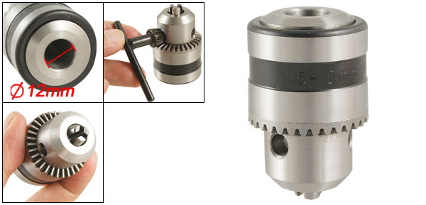 Product Name Keyless Drill Chuck Capacity 1.5-10mm / 0.059" - 0.394" Taper bore B12 Top Hole Diameter 12mm/ 0.472" Drill Chuck Outer Diameter 33mm/ 1.3" Drill Chuck Total Length 61mm/ 2.4" Pilot Total Size 57 x 32mm/ 2.2" x 1.3" (L*W) Color Black & Silver Tone Material Metal Net Weight 179g Package Content 1 x Drill Chuck