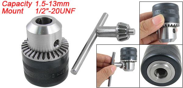 Product Name Key Type Drill Chuck Capacity 1.5-13mm Mount 1/2"-20UNF Overall Size(Approx) 42 x 58 x 30mm / 1.65" x 2.28" x 1.18"(Top D*H*Bottom D) Key Size 80 x 41mm / 3.1" x 1.6"(L*W) Color See the Picture Material Metal Weight 296g Package Content 1 x Key Type Drill Chuck, 1 x Key Tool - Reviews