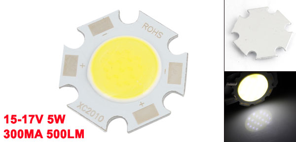 Product Name COB LED Lamp Chip Rated Voltage 15-17V Luminous Flux 500LM Color Temperature 6000-6500K Power 5W Current 300mA Light Color Pure White Material Aluminum Color Silver Tone, Yellow Diameter 20mm/ 0.79" Luminous Surface 11mm/ 0.43" Weight 2g Package Content 1 x COB LED Lamp Chip - Reviews