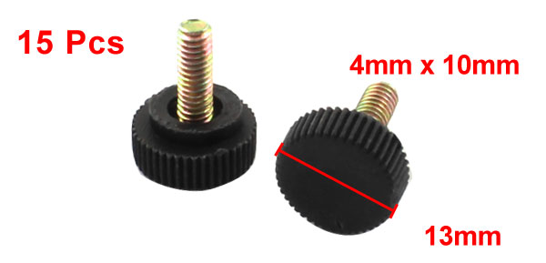 Product Name Straight Knurled Knob Type Screw On Head Diameter 13mm / 0.51" Thread Size 4 x 10mm / 0.16" x 0.39"(D*L) Total Height 16mm / 0.63" Material Metal, Plastic Color Bronze Tone, Black Total Weight 29g Package Content 15 x Straight Knurled Knob - Reviews