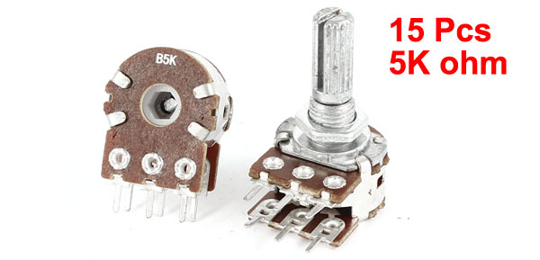 Product Name Potentiometer Resistance Value 5K ohm Power AC 220V 6A Adjustment Type Top Adjustment Type Dual Linear(Type B) Features Knurled Shaft Shaft Diameter 6mm / 0.2" Shaft Length 13mm / 0.55" Mounting Thread Diameter 6.6mm / 0.26" Base Size 16 x10mm / 0.63" x 0.39"(D*H) Total Height 31mm/1.1" Material Metal, Electronic Parts,Carbon Film Net Weight 124g Package 15 x Potentiometer - Reviews