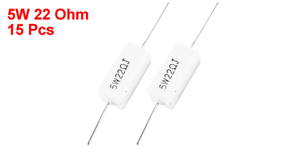 Details15 Pcs 5W Watt 22 Ohm 5% Ceramic Cement Power Resistor White  Product Name Cement Resistor Body Material Cement Power 5W Resistance 22 Ω Tolerance ±5% (J) Body Size (Approx.) 21 x 9 x 9mm/0.8" x 0.35" x 0.35" (L * W * H) Lead Diameter(Approx.) 0.7mm/0.027" Color White Weight 70g Package Content 15 x Cement Resistors