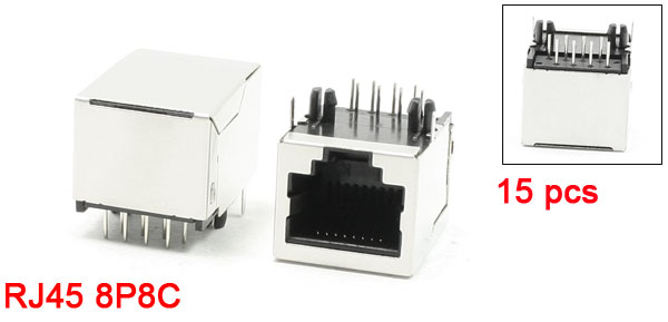 Product Name RJ45 PCB Jack Feature RJ45 8P8C Material Plastic, Stainless Steel Color Black, Silver Tone Total Pin Number 8 Pin Type Round Pin,PCB Mounting Pin Angle & Location Right Angle Pins in the Rear Each Size (Approx.) 20 x 15.5 x 14mm / 0.8" x 0.6" x 0.55" (L*W*H) Net Weight 89g Package Content 15 x RJ45 PCB Jack - Reviews
