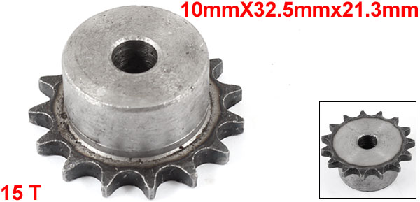 Product Name Sprocket Material Metal Color Gray Teeth Number 15 Inner Hole Diameter 10mm / 0.394" Outer Shank Dia 32.5mm/1.28" Overall Size 48 x 21.3mm/1.9" x 0.83"(Max.Dia*H) Net Weight 143g Package Content 1 x Sprocket(Non-OEM) - Reviews