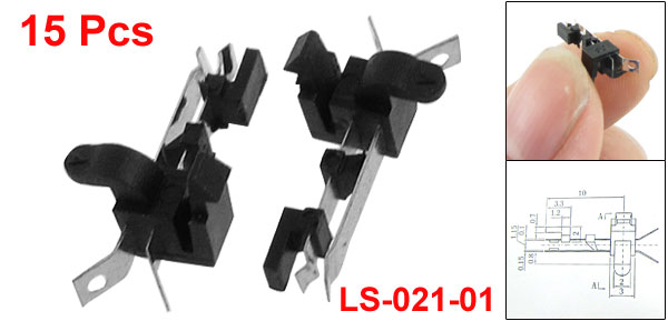 Product Name Leaf Switch Model No. LS-021-01 Contact 1P1T Rated Voltage DC 30V 0.4A Withstand Voltage AC 150V for 1 Minute Contact Resistance 30M ohm Max. at 1A 5V DC Insulation Resistance 100M ohm Max. at 500V DC Color Black, Silver Tone Material Plastic, Metal Size As picture shown Weight 3g Package 15 x Leaf Switch - Reviews