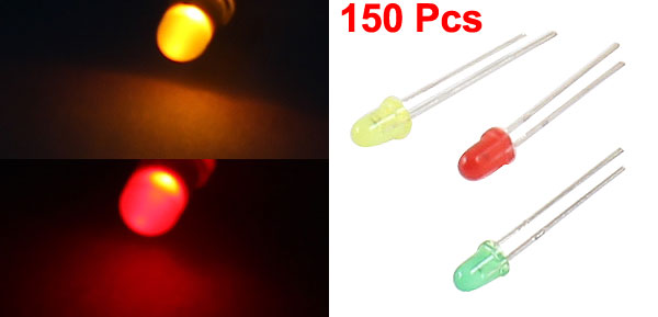 Product Name Light Emitting Diodes Emitting Light Color Red, Green, Yellow Forward Voltage DC 3V Head Dia(Approx) 3mm / 0.12" Terminal Center Distance(Approx) 2.5mm/0.1" Overall Height (Approx) 23mm/0.9" Color Red, Green, Yellow, Silver Tone Material Plastic, Metal Weight 46g Package Content 150 Pcs(±2%) x Light Emitting Diodes