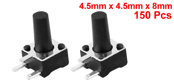 Details150 Pcs 4.5mmx4.5mmx8mm 3 Pins Momentary Tactile Tact Push Button Switch  Product Name Tact Switch Type SPST Action Type Momentary Dimension 4.5 x 4.5 x 8mm / 0.18"x 0.18"x 0.31"(L*W*H) Button Dia 2mm / 0.08" Pin Length 1.5mm/0.06" Material Plastic, Metal, Electric Parts Color Black, Silver Tone Net Weight 23g Package Content 150(±2%) x Tact Switch