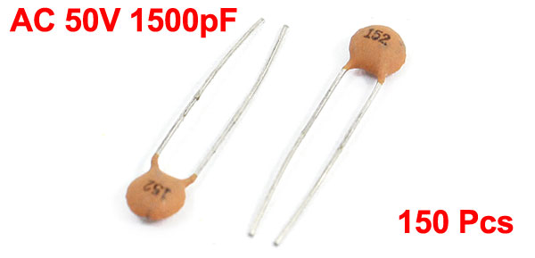 Product Name Ceramic Disc Capacitors Rated Voltage AC 50V Capacitance 1500pF Body Size 4 x 3.5 x 2mm/ 0.16" x 0.14" x 0.08" (L*W*T) Lead Space 2mm/ 0.08" Lead Length 14mm/ 0.55" Main Color Brown, Silver Tone Weight 10g Package Content 150(±2%) Pcs x Ceramic Disc Capacitors - Reviews