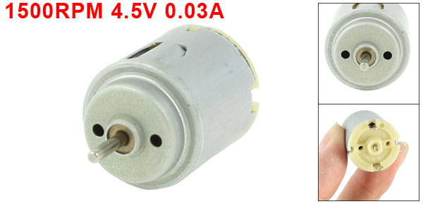 Product Name DC Motor Rated Voltage DC 4.5V Rated Current 0.03A Speed 1500RPM Mounting Hole Diameter 2mm/0.08" Mounting Hole Center Distance 10mm/0.4" Shaft Size 2 x 8mm/ 0.08" x 0.3"(D*L) Body Size 25 x 21mm/ 1" x 0.8" (H*D) Main Color Silver Tone External Material Metal, Plastic Net Weight 20g Package 1 x DC Motor - Reviews