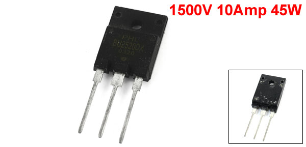 Details1500V 10Amp 45W High Switching Speed Silicon NPN Transistor BU2520DX  Product Name Silicon NPN Power Transistor Model No. BU2520DX Mounted Type Through Hole Collector Current 10A Collector Base Voltage 1500V Collector Power Dispittation 45W Mounting Hole Diameter 3.2mm / 0.1" Pin Size 20 x 5mm / 0.79" x 0.22" ( L* Pitch) Total Size 42 x 14 x 5mm / 1.65" x 0.55" x 0.20" (L*W*H) Main Material Silicon Weight 4g Package 1 x Silicon NPN Power Transistor