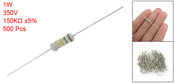 Product Name Carbon Film Resistor Material Type Carbon Film Rated Power 1W Resistance Value 150K ohm Tolerance ±5% Withstand Voltage 350V Body Size (Approx.) 10.7 x 3.5mm /0.42" x 0.14" (L*Dia.) Lead Size (Each End) 23 x 0.4mm/0.9" x 0.016" (L*Dia.) Color As Picture Shown Weight 169g Package Content 500 Pcs(±2%) x Carbon Film Resistors - Reviews