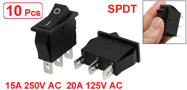 Product Name Rocker Switch Poles SPDT Terminals 3 Pin (On-On) Rating Voltage AC 250V 15A AC 125V 20A Total Size(Each One) 3 x 1.4 x 3.8cm/ 1.2" x 0.55" x 1.5"(L*W*T) Mounting Size 2.6 x 1 x 3cm/ 1" x 0.4" x 1.2"(L*W*T) Color Black Material Plastic, Metal Total Weight 70g Package Content 10 x Rocker Switch - Reviews