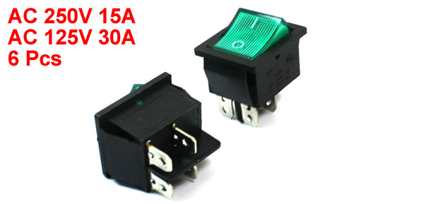 15A 250VAC 30A 125VAC Green Button DPST 4 Pin Snap in Mount Rocker Switch 6Pcs