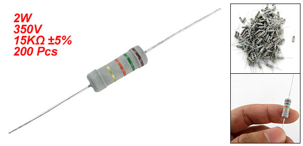 Product Name Carbon Film Resistors Material Type Carbon Film Rated Power 2W Resistance Value 15K ohm Tolerance ±5% Withstand Voltage 350V Total Size 60 x 5mm / 2.36" x 0.196" (L * D) Lead Diameter 0.4mm / 0.0157" Color As Picture Shown Weight 170g Package Content 200 Pcs (± 2%) x Carbon Film Resistors - Reviews