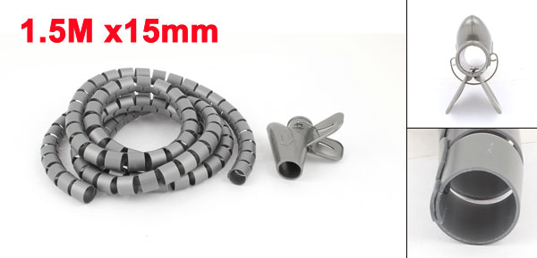 1.5m 5ft 15mm Dia Spiral Wrapping Bands Cable Organizer Wrap w Wire Guide Clips