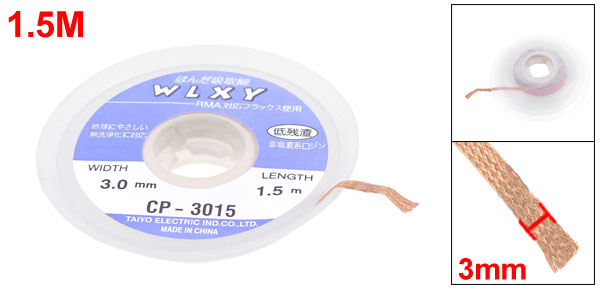 Product Name Desoldering Wire Length 1.5M / 59" Width 3mm / 0.12" Reel Diameter 5.5cm / 2.2" Material Copper (Wire)Plastic (Reel) Main Color Copper Red (Wire)