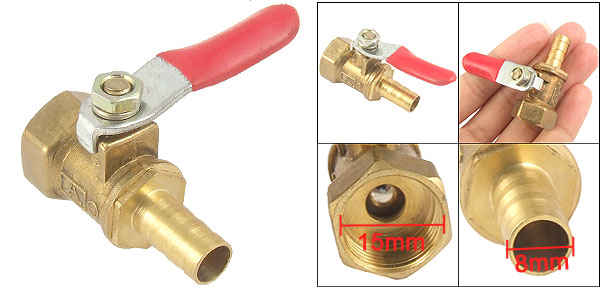 Product Name Ball Valve Thread Diameter 15mm/0.59" Ball Hole Diameter 6.7mm / 0.26" Hose Tail OD 8mm/0.31" Level Handle Size 45 x 11mm / 1.77" x 0.43" (L*W) Overall Size 53 x 20 x 33mm/2.1" x 0.8" x 1.3" (L*W*H) Color Gold Tone & Red Material Brass & Metal Weight 36g Package 1 x Ball Valve - Reviews