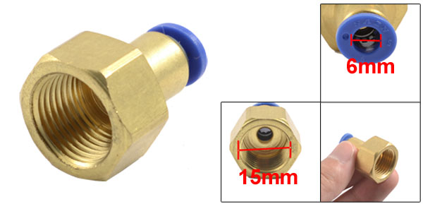 Item Name Quick Fittings Total Size 29 x 23mm/ 1.1'' x 0.9'' (L*Max.D) Thread Diameter 15mm/ 0.59'' Fit Tube Outer Diameter 6mm/ 0.24'' Material Metal, Plastic Color Gold Tone, Blue Weight 26g Package Content 1 x Quick Fittings - Reviews