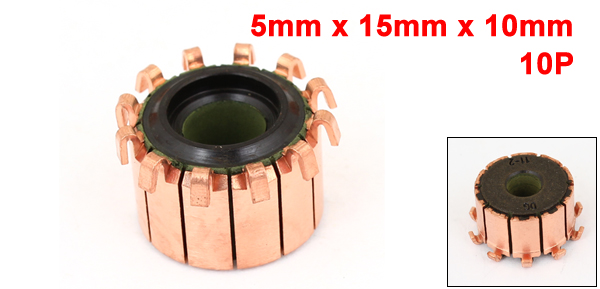 Product Name Commutator Color Copper Tone Material Copper, Steel Size 5 x 15 x 10mm / 0.19" x 0.6" x 0.39" (Shaft D*OD*H) Gear Tooth Quantity 10 Pcs Net Weight 9g Package Content 1 x Commutator - Reviews