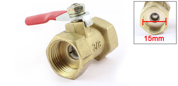 Details15mm x 15mm Female Thread Air Compressor Ball Valve Brass Tone  Product Name Gas Ball Valve Material Brass, Plastic Color Brass Tone, Red Female Thread Diameter 15mm/ 0.59" Body Overall Size 32 x 19mm/ 1.26" x 0.75"(L*D) Lever Size 45 x 11mm/ 2" x 0.4"(L*W) Weight 38g Package Content 1 x Compressor Gas Valve