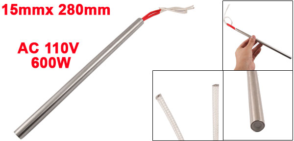 Product Name Cartridge Heater Material Stainless Steel, PVC, Nylon Rated Voltage AC 110V Power 600W Heater Size (Approx.) 15 x 280mm / 0.59" x11" (D * L) Wire Length (Approx.) 27cm/ 10.6" Color Red, Silver Tone Weight 190g Package Content 1 x Cartridge Heater - Reviews