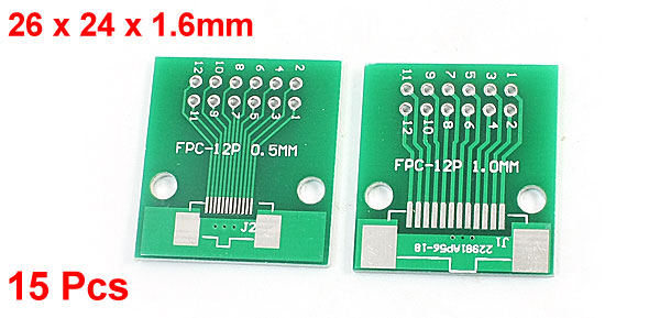 Product Name FPC/FFC-12P PCB Adapter Plate Pin Pitch 0.5mm/0.02", 1mm/0.04" Fixing Hole Dia 3mm/0.12" Fixing Hole Center Distance 18mm/ 0.71" Body Size 26 x 24 x 1.6mm/1" x 0.94" x 0.06"(L*W*T) Material Electronic Part, FR-4 Main Color Green Total Weight 19g Package Content 15Pcs x FPC/FFC-12P PCB Adapter Plate - Reviews