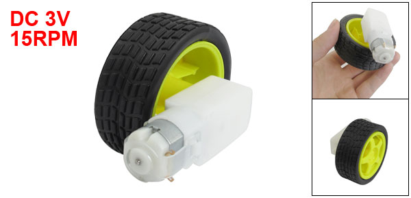 Details15RPM 3V Monoaxial DC Geared Motor w Plastic Tire Wheel for DIY Robot Smart Car  Product Name DC Geared Motor Rated Voltage DC 3V Speed 15RPM Plastic Tire Wheel Size 65 x 26mm/2.5" x 1"(D*T) Motor Size 6.5 x 2.3 x 1.8cm/2.5" x 0.9" x 0.7"(L*W*T) Color White, Yellow, White, Silver Tone Net Weight 67g Package Content 1 x DC Geared Motor w Plastic Tire Wheel