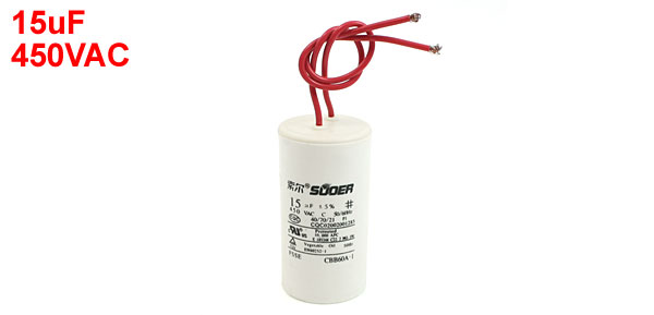 Product Name Motor Capacitor Housing Material Plastic Dielectric Material Metallized Polypropylene Film Model CBB60A-1 Capacitance 15uF Tolerance ±5% Rated Voltage 450VAC Frequency 50/60Hz Temperature Coefficient 40/70/21 Body Size 3.8 x 7.3cm / 1.5" x 2.9" (D * H) Wire Length 15.5cm / 6.1" Color White, Red Weight 72g Package Content 1 x Motor Capacitor - Reviews