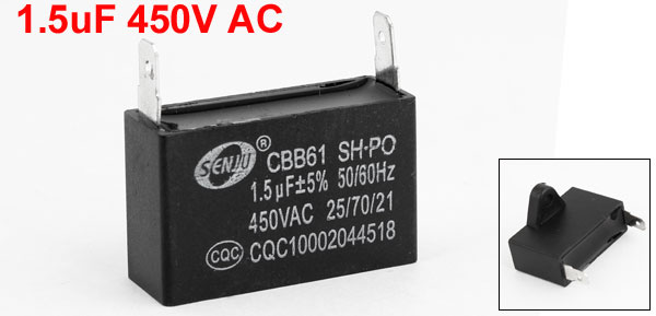 Product Name Motor Capacitor Housing Material Plastic Dielectric Material Metallized Polypropylene Film Model CBB61 Capacitance 1.5uF Tolerance ±5% Rated Voltage 450VAC Frequency 50/60Hz Temperature 25/70/21 Pin Spacing(Approx.) 4.25cm/1.67 Overall Size 3.6 x 2.3 x 1cm/1.4" x 0.9" x 0.4"(L*W*H) Color Black Weight 14g Package Content 1 x Motor Capacitor - Reviews