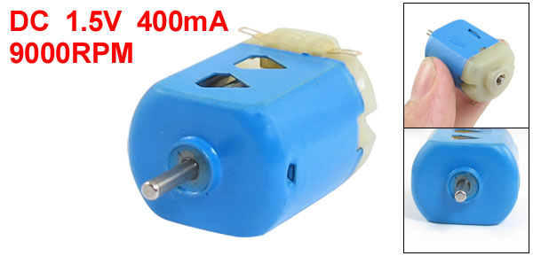 Product Name DC Motor Model 130 Rated Voltage 1.5VDC Current 400mA Speed 9000RPM Pin Quantity 2 Shaft Size 2 x 7mm/ 0.08" x 0.28" (D*L) Body Size 27 x 20 x 15mm/ 1" x 0.8" x 0.6" (L*W*T) Main Color Light Blue Material Metal, Electronic Parts Weight 19g Package 1 x DC Motor  - Reviews