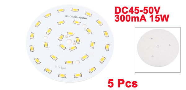 Product Name LED Aluminum Base Light Type LED LED Type SMD 5630 Light Color Warm White Light Quantity 30 Luminous 80lm/w Color Temperature 3500K Power 15W Voltage DC 45-50V Current 300mA Material Electronic Parts, Aluminum Base Diameter 100mm/4" Net Weight 167g Package Content 5 x LED Aluminum Base - Reviews
