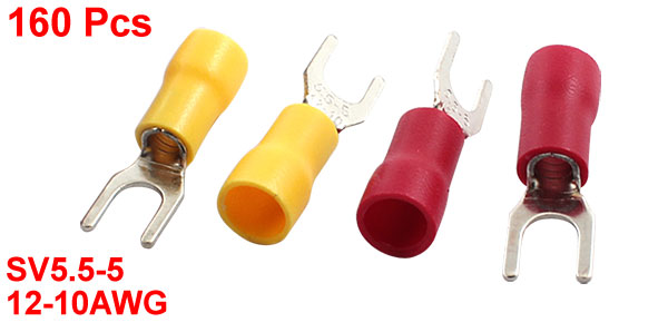 Product Name Fork Terminal Model SV5.5-5 Fit Cable Size 4-6mm2 (12-10AWG), 10# Hole Dia 6.4mm/0.25" Total Length 25.2mm/ 1'' Max. Current 48A Material PVC Plastic, Metal Color Red, Yellow Weight 159g Package Content 160Pcs (±2%) x Fork Terminal - Reviews