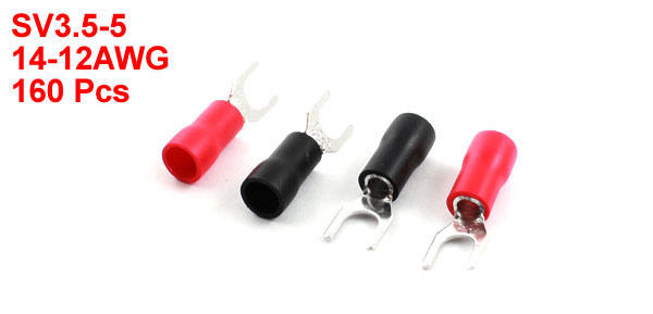 Product Name Fork Terminal Model SV3.5-5 Fit Cable Size 2.5-4mm2 (14-12AWG), 10# Hole Dia 6mm/0.24" Total Length 24.8mm/ 1'' Max. Current 37A Material PVC Plastic, Metal Color Black, Red Weight 141g Package Content 160Pcs (±2%) x Fork Terminal - Reviews
