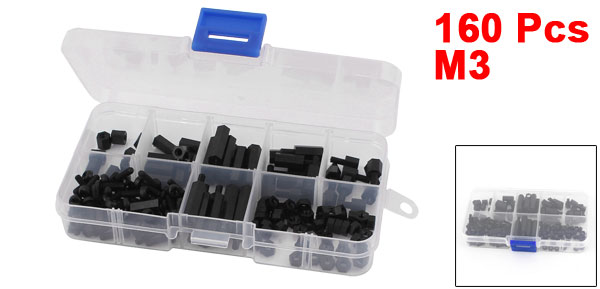 Product Name Hex Spacers Screw Nut Stand-off Assortment Kit Material Nylon, Plastic(Box) Box Size 128x65x24mm Screw Size M3 Color Black Weight 56g Package Content 160 Pcs Hex Spacers Screw Nut Stand-off Assortment Kit