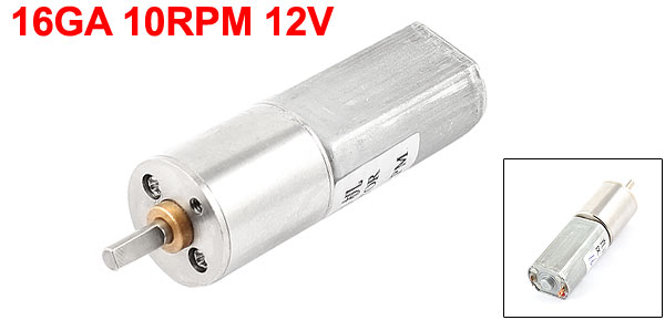 Product Name DC Motor Model 16GA Rated Voltage DC 12V Speed 10 RPM Mounting Screw Hole Diameter 1mm/0.04" Shaft Size 3 x 8mm/ 0.12" x 0.31"(D*L) Body Size 16 x 45mm/ 0.63" x 1.8" (D*H) Main Color Silver Tone Material Metal Net Weight 32g Package 1 x DC Motor - Reviews
