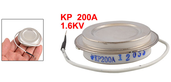 Details1.6KV 200A KP Capsule Disc Type Rectifier Thyristor  Product Name High Current Rectifier Model KP Material Metal, Silicon, Ceramic Max. Repetitive Peak Reverse Voltage 1.6KV Max. Average Forward Current 200A Total Size 4.9 x 1.3cm/1.9" x 0.5" (Dia*T) Wire Length 20cm/7.9" Color Silver Tone Net Weight 85g Package Content 1 x High Current Rectifier
