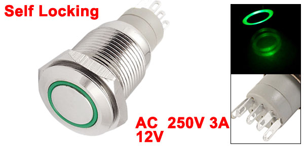 16mm 12V Green LED 250VAC 3A Self-locking Stainless Push Button Switch