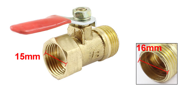 Product Name Full Port Ball Valve Male Thread Diameter 16mm/0.63'' FemaleThread Diameter 15mm/0.6" Male /Female Thread Size 3/8" PT Level Handle Size(Red Part) 26 x 11mm/1'' x 0.43'' (L*W) Overall Size 34.3 x 18 x 28mm/1.35'' x 0.71'' x 1.1'' (L*W*H) Color Gold Tone, Red Material Metal Weight 36g Package 1 x Full Port Ball Valve - Reviews