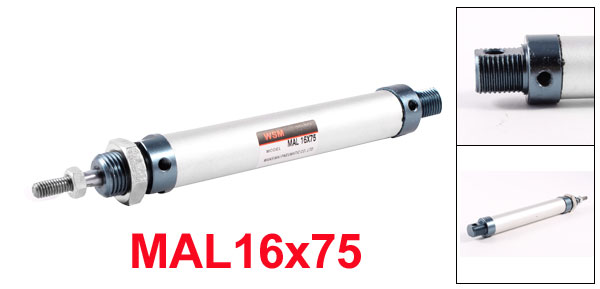 Product Name Air Cylinder Model MAL16x75 Rod Type Single Rod Action Type Double Action Bore 16 mm / 0.63" Stroke 75 mm / 2.9" Hole Diameter 6 mm / 0.24" Thread Rod Diameter 6 mm / 0.24" Thread Tang End Size 16 x 12 mm / 0.63" x 0.47" (D*T) Operating Pressure 0.1~0.9Mpa (1~9kgf/cm2) Total Size (Approx.) 185 x 20 mm / 7.3" x 0.8" (L*Max.D) Main Material Aluminum Alloy Color Silver Tone, Steel Blue Weight 119g Package Content 1 x Air Cylinder - Reviews