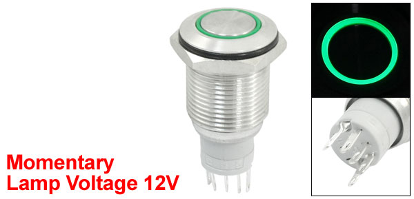 Item Name Push Button Switch Action Type Momentary Type Head Shape Round Flat Head LED Type Ring-Illuminated LED Contact SPDT(1NO 1NC 1Com ) Switch Rating 250VAC 3A LED Color Green Lamp Voltage 12V Pin Number 5 Thread Diameter 16mm/0.63" Total Size 38 x 19mm/1.5" x 0.75"(L*Max.W) Material Stainless Steel, Plastic, Electric Parts Housing Color Silver Tone Weight 14g Package Content 1 x Push Button Switch - Reviews